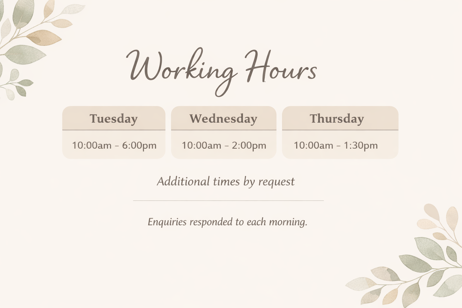 If you’re unable to find a suitable appointment time, please use the Contact Us page to get in touch. I’ll do my best to review your request and come back to you.